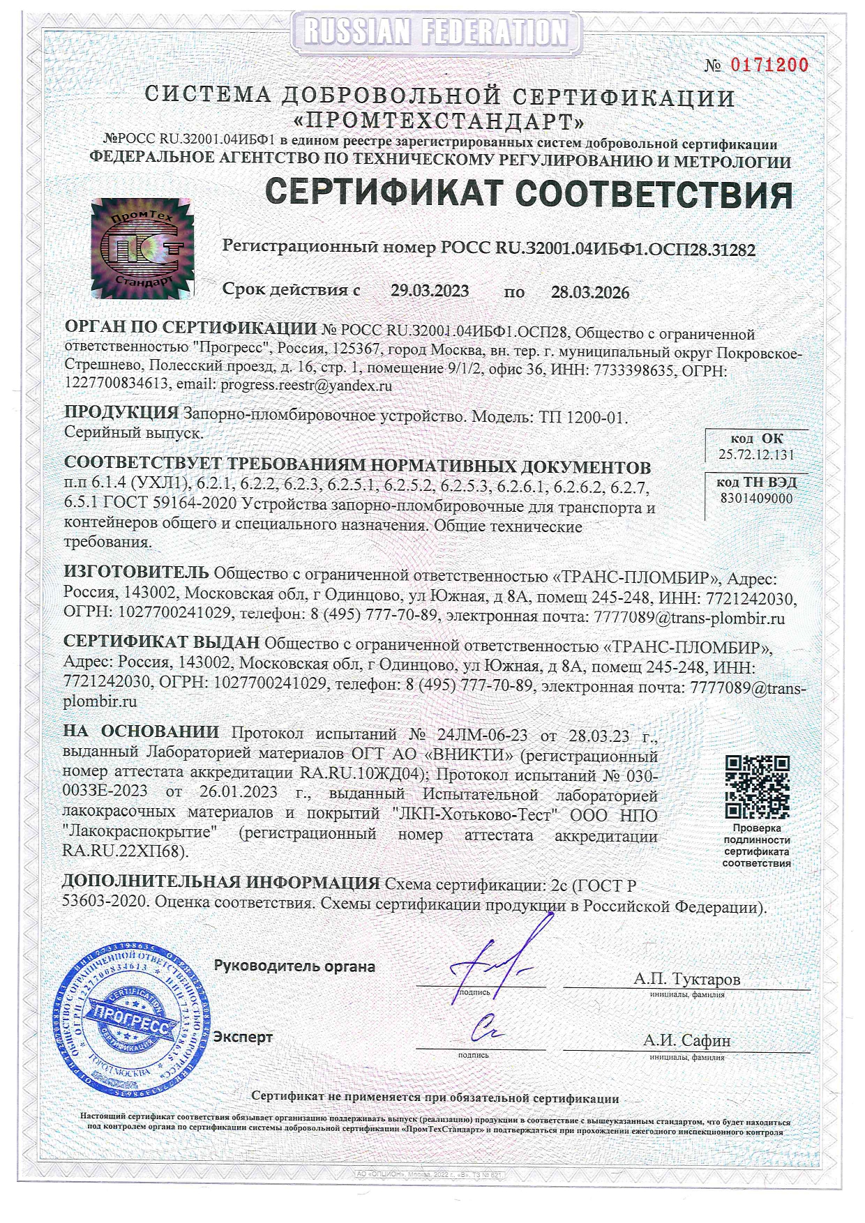 Запорно-пломбировочное устройство "ТП 1200-01", изготовленное фирмой ООО "ТРАНС-ПЛОМБИР" по конструкторской документации ТП 1200-01, предназначено для пломбирования грузовых контейнеров с диаметром пломбировочного отверстия не менее 10 мм.