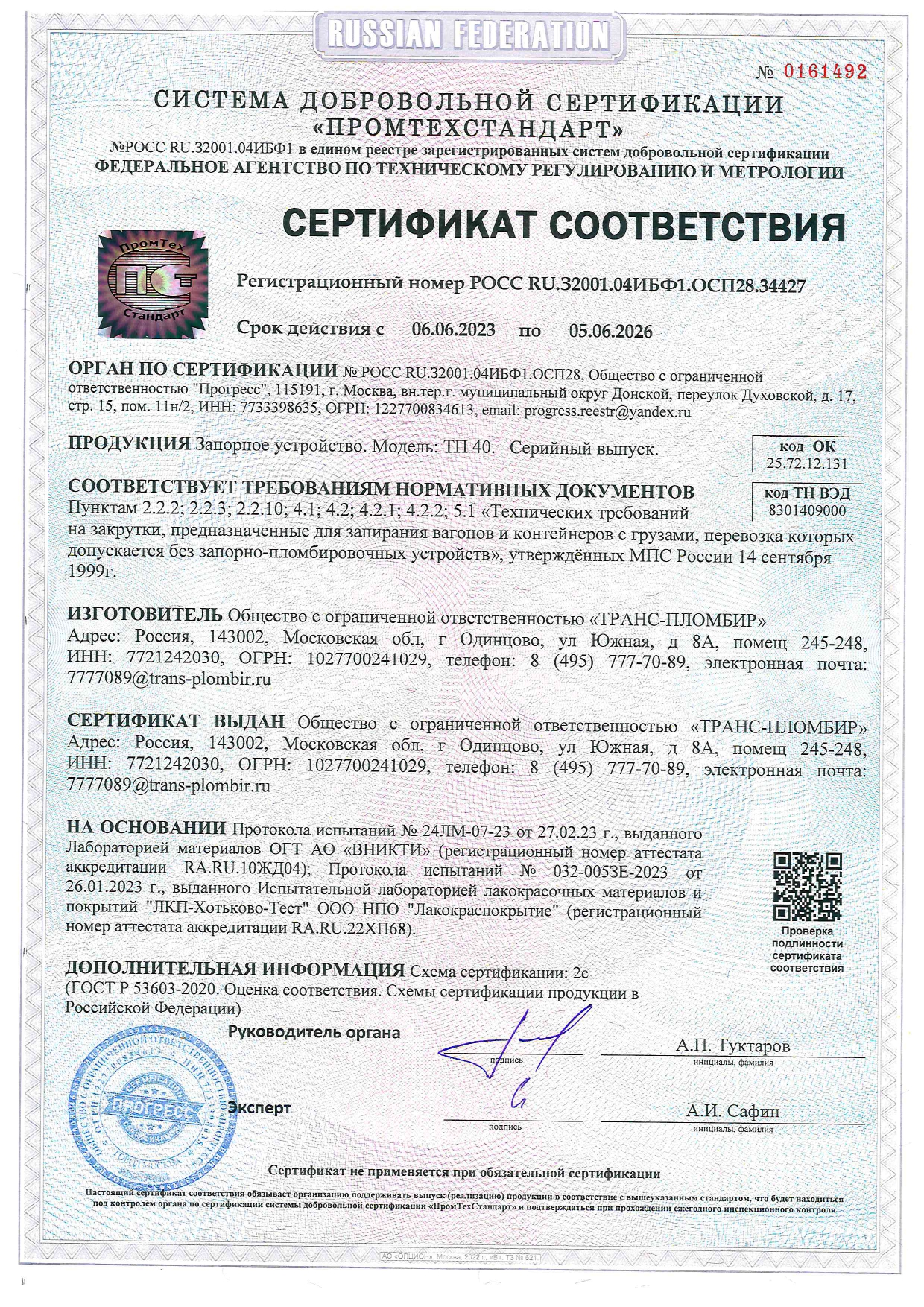 ЗУ ТП-40 предназначено для запирания крытых вагонов, вагонов - хопперов, вагонов - цистерн, изотермических вагонов, крытых вагонов для перевозки легковых автомобилей, а также контейнеров с диаметром отверстий в запорных и пломбировочных узлах не менее 6 мм.