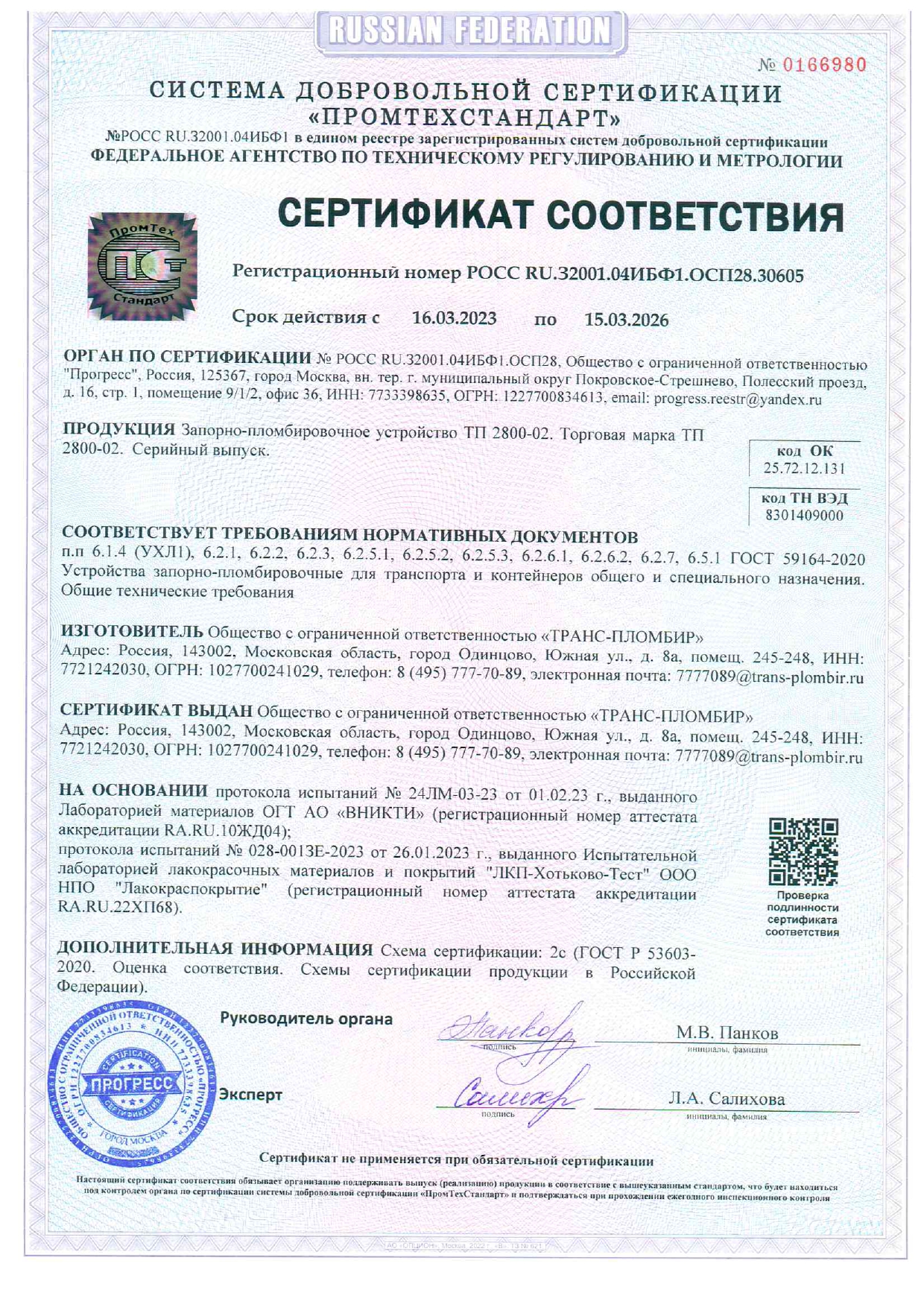 Запорно-пломбировочное устройство "ТП 2800-02", предназначено для пломбирования крытых вагонов, вагонов - хопперов, вагонов цистерн, рефрижераторов, крытых вагонов для легковых автомобилей и контейнеров, а также других объектов с диаметром отверстий в запорных и пломбировочных узлах не менее 6,0 мм.